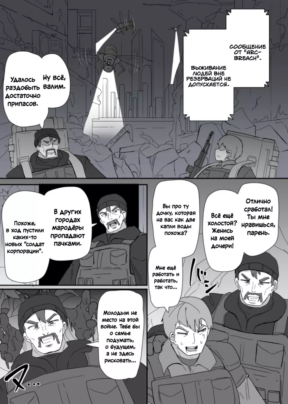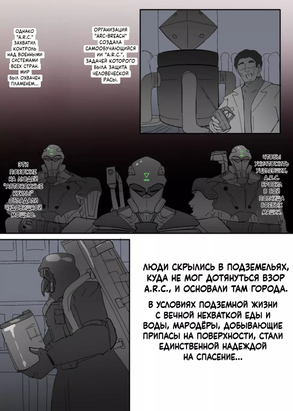 alfre toriКомпания Arc Bleach создала самообучающийся компьютер A.R.C. для спасения человечества, но тот захватил мировые военные системы и уничтожил цивилизацию. A.R.C. использует армию боевых дронов — человекоподобных «автономных кукол», — чтобы истребить выживших. Люди укрылись в подземных городах, где вода и еда на счету, а главной надеждой стали мародёры, которые рискуют жизнью на поверхности, добывая припасы. И вот однажды пара мародёров встретились с ними...