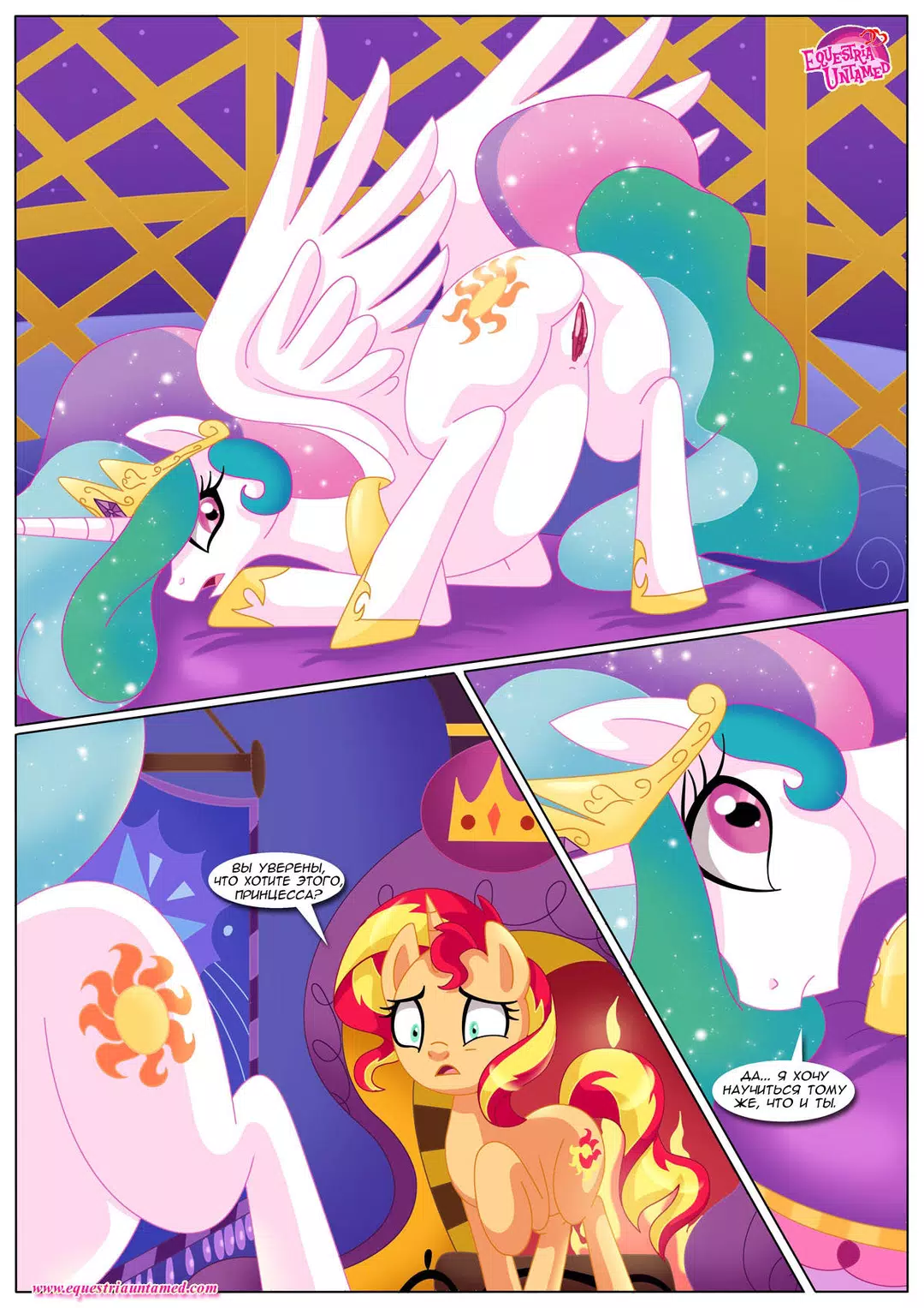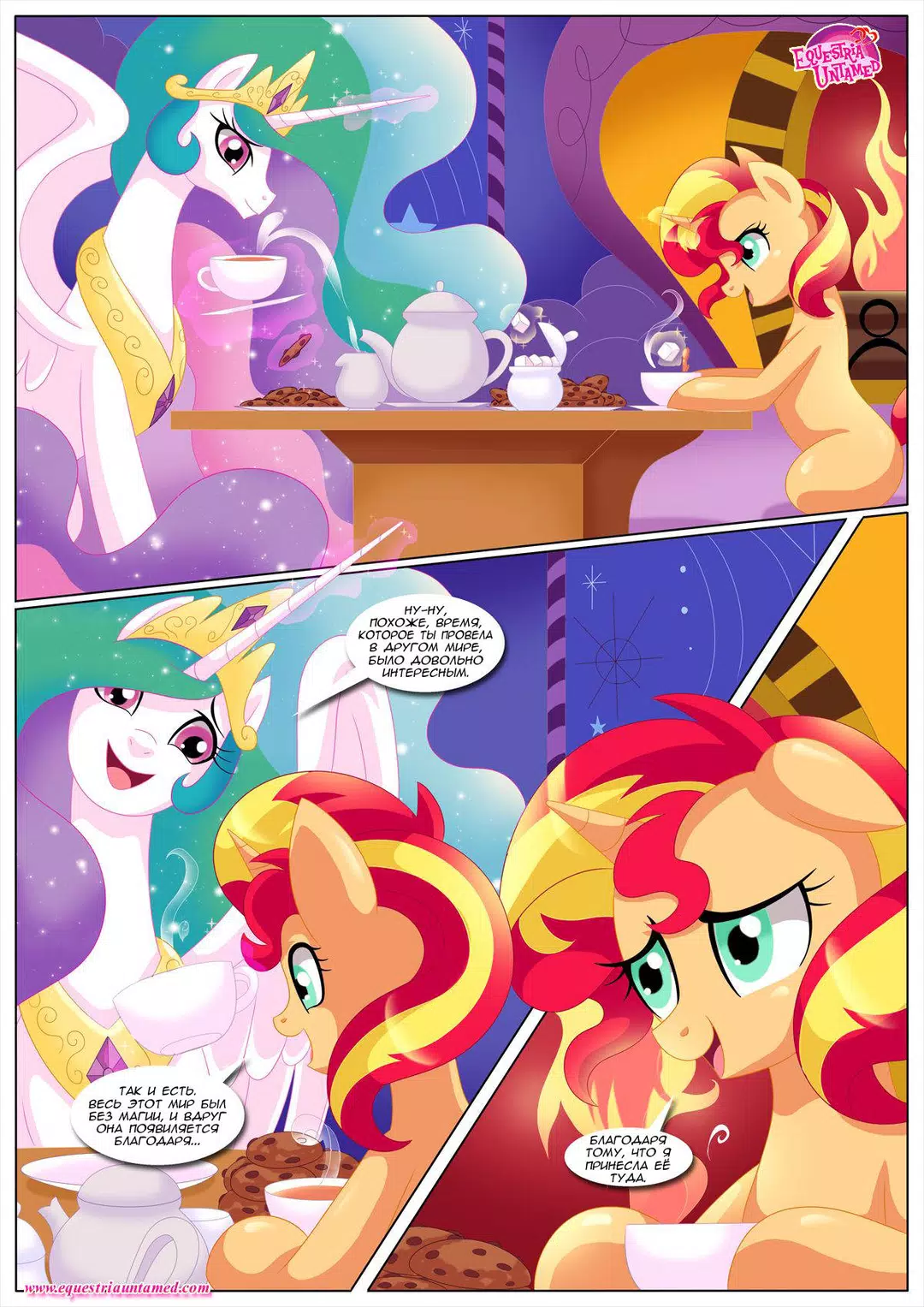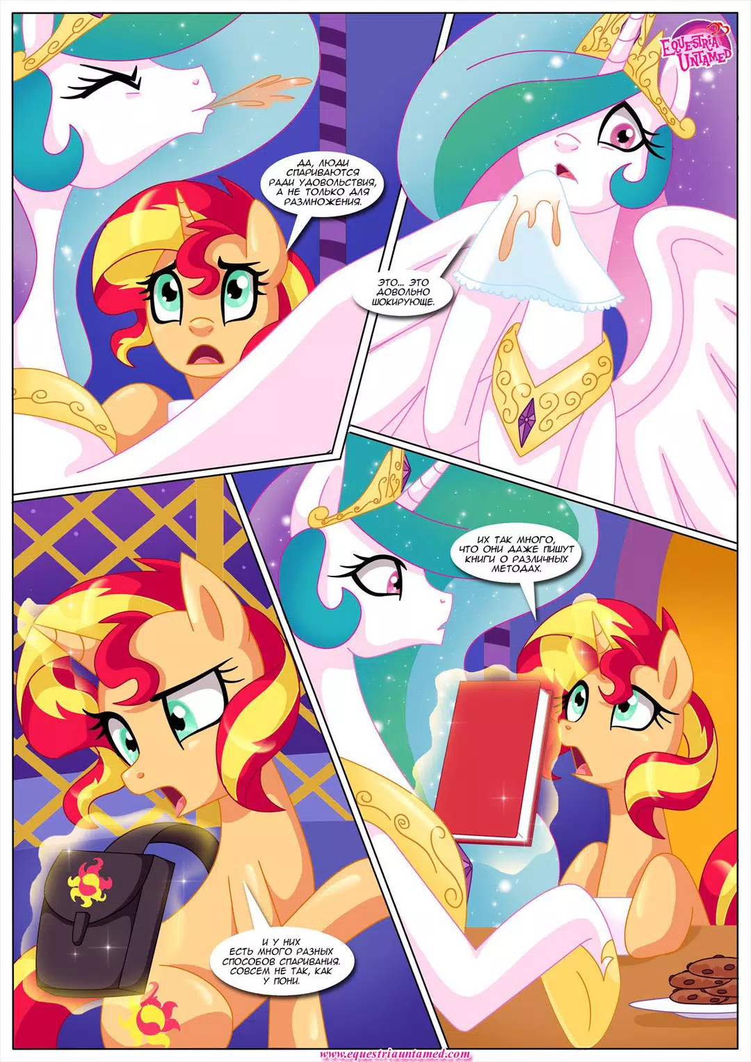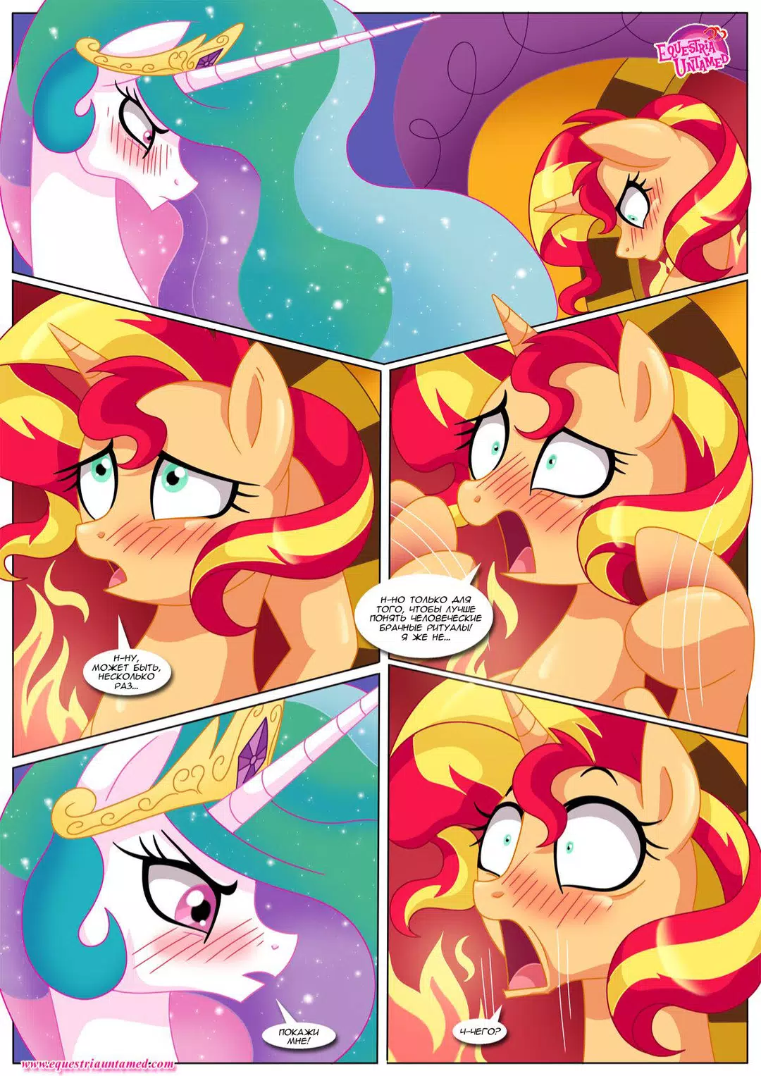 Сансет Шиммер решила вернуться в Эквестрию, чтобы проведать своего старого учителя. В непринуждённой беседе с Принцессой Селестией за чашечкой чая, речь зашла о человеческих брачных ритуалах. И Принцесса неожиданно заинтересовалась. А у Сансет и книжка нужная в сумке нашлась и несколько занятных учебных пособий. В общем, урок удался. Кстати, книга называлась "Кама сутра"
