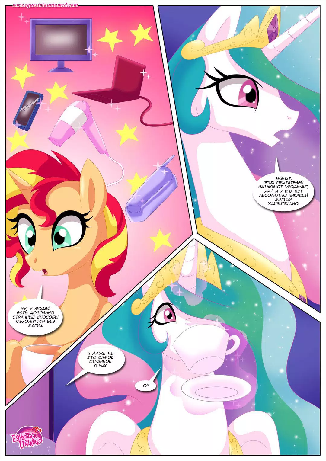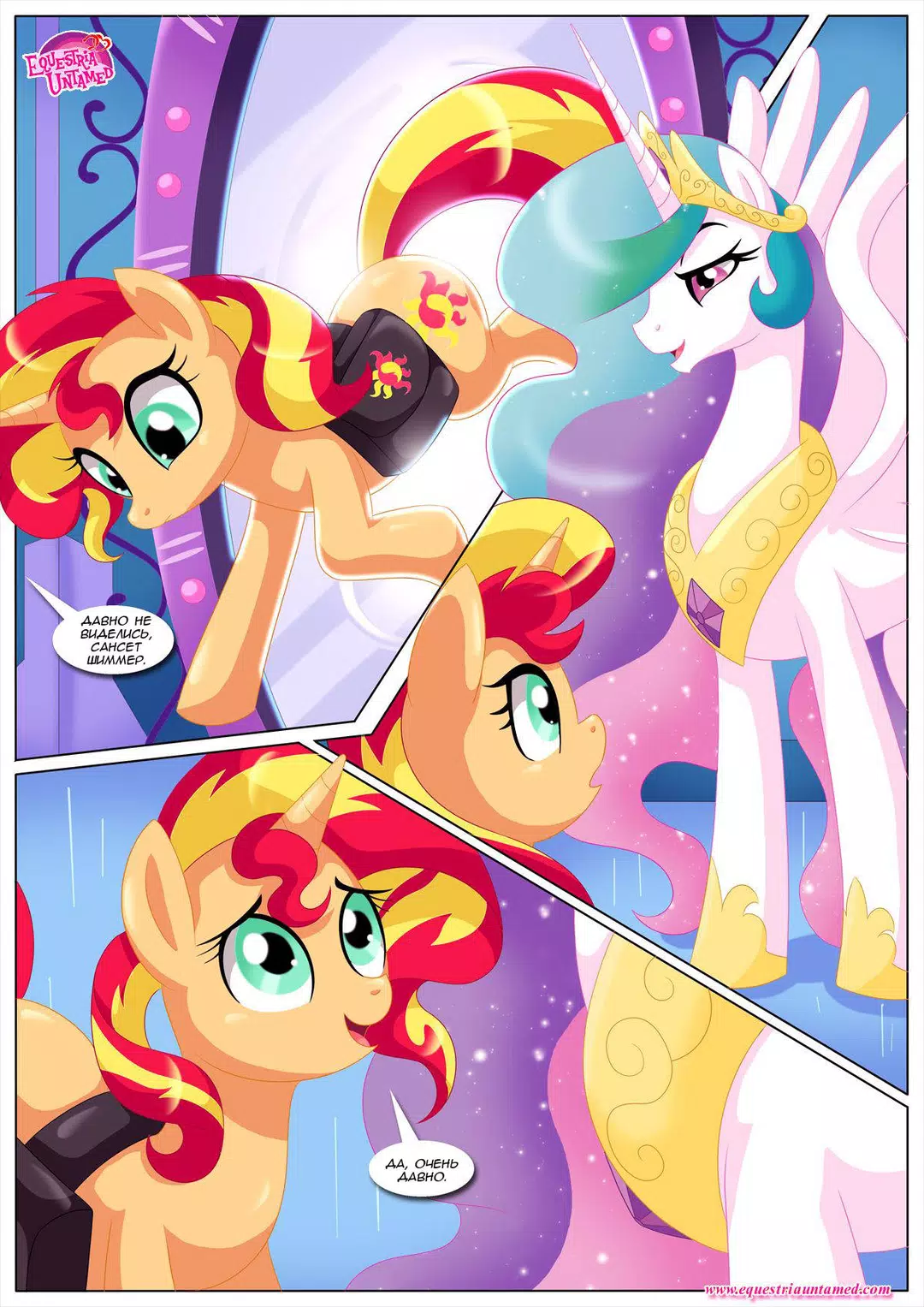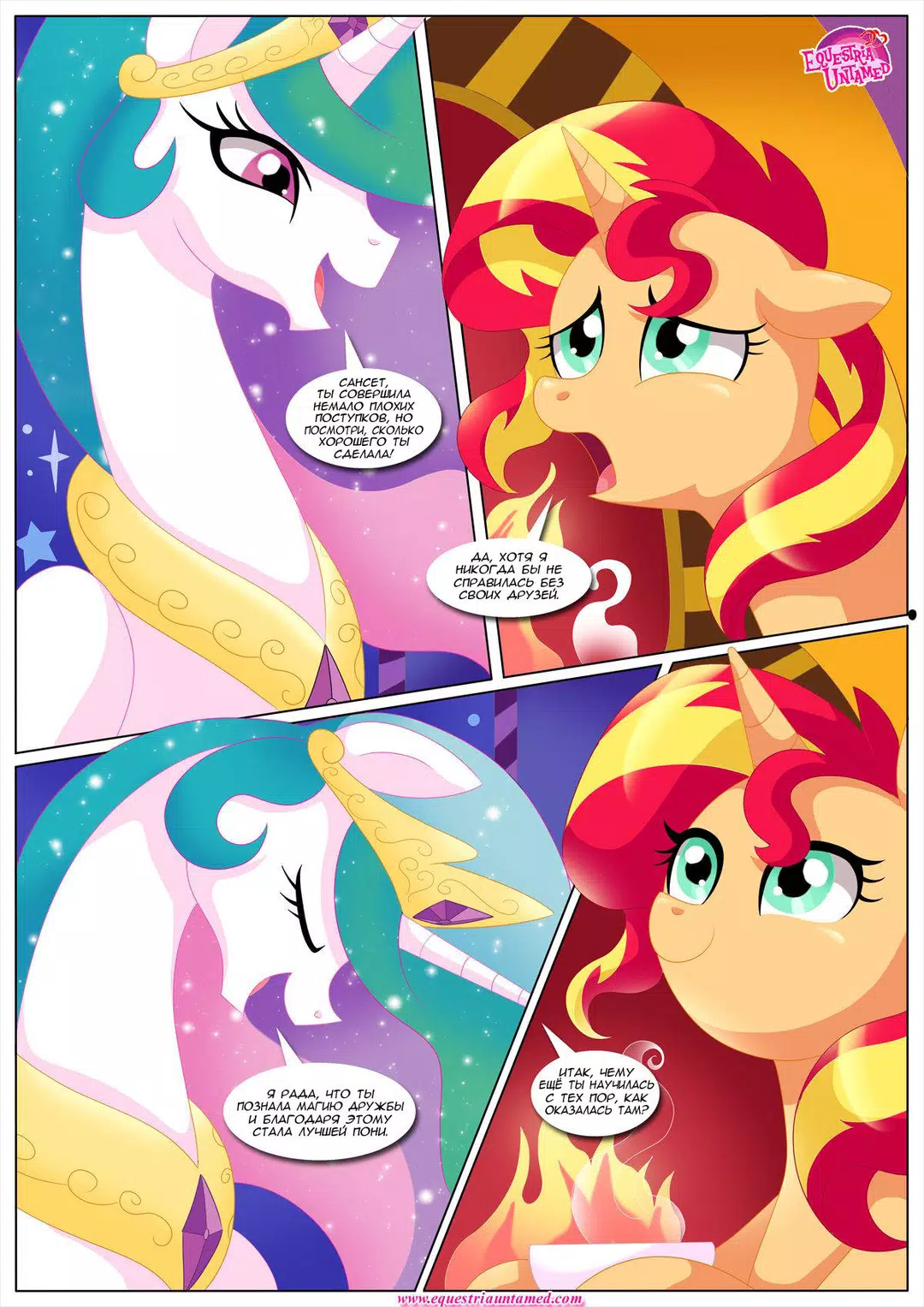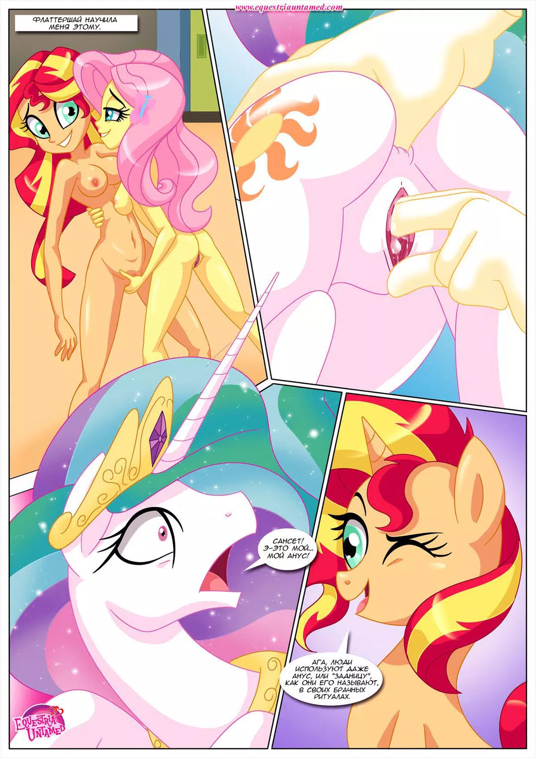 Сансет Шиммер решила вернуться в Эквестрию, чтобы проведать своего старого учителя. В непринуждённой беседе с Принцессой Селестией за чашечкой чая, речь зашла о человеческих брачных ритуалах. И Принцесса неожиданно заинтересовалась. А у Сансет и книжка нужная в сумке нашлась и несколько занятных учебных пособий. В общем, урок удался. Кстати, книга называлась "Кама сутра"